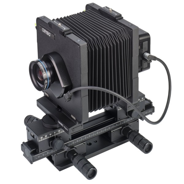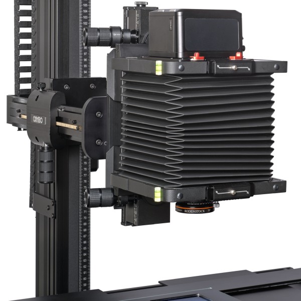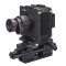 Its front and rear standards - without tilt and swing, to assure parallelity - are attached to a 42cm monorail and linked by a standard 40cm bellows. Longer bellows and rails, as needed for larger magnifications and long focal lengths, are available. To faciltate stitiching or for ease of positioning both standards can be fitted with lateral shift on request.