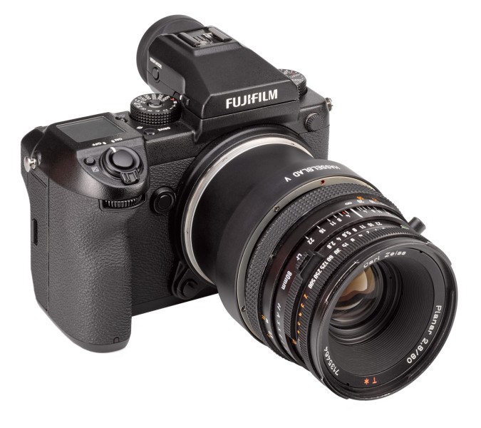 This HV-GFX lens adapter allows the use of Hasselblad-C lenses in combination with the Fujifilm GFX camera body.