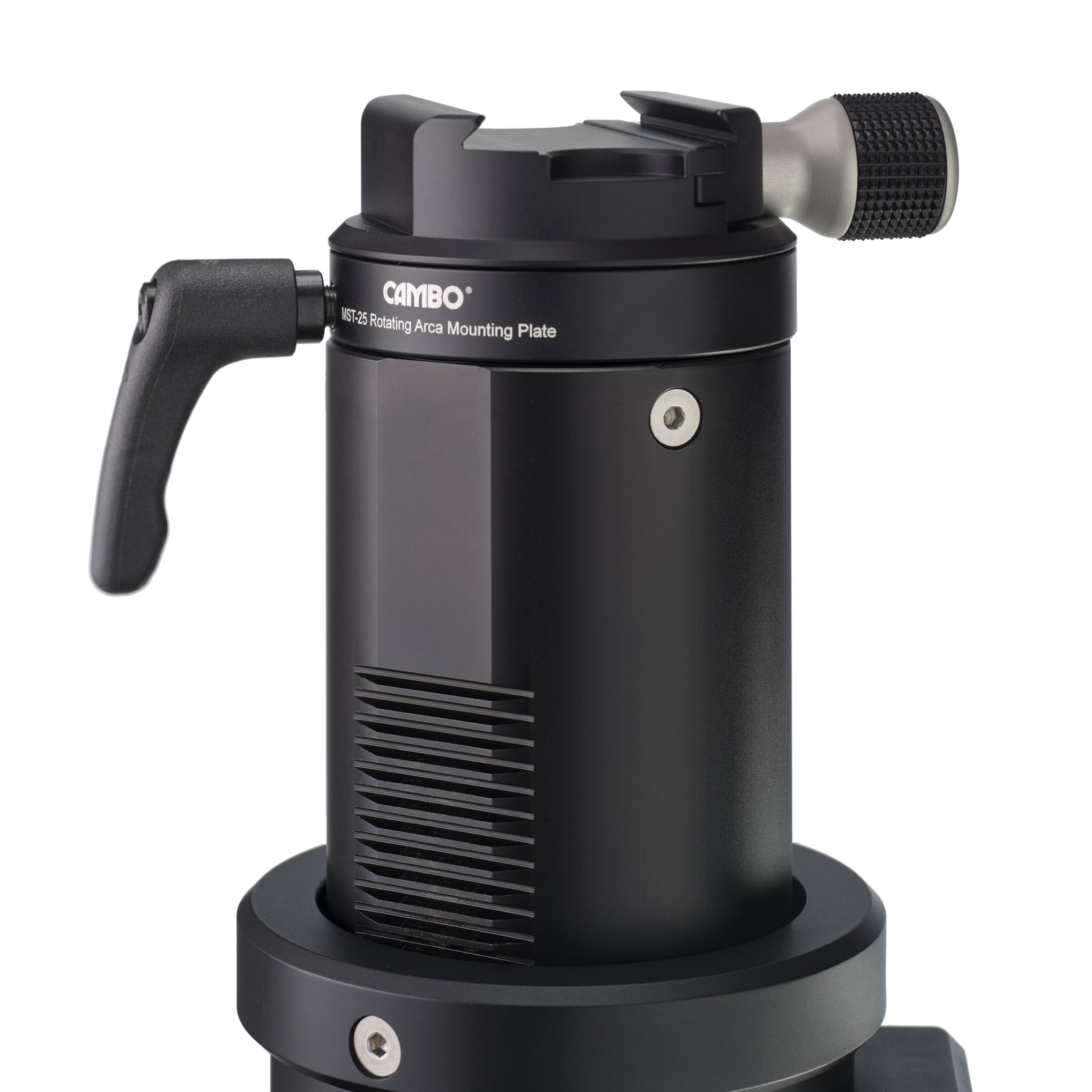 The MST-25 snaps into the MST stand's column and is securely locked with a V-Groove. It has a rotating top plate with Arca style quick release mount.