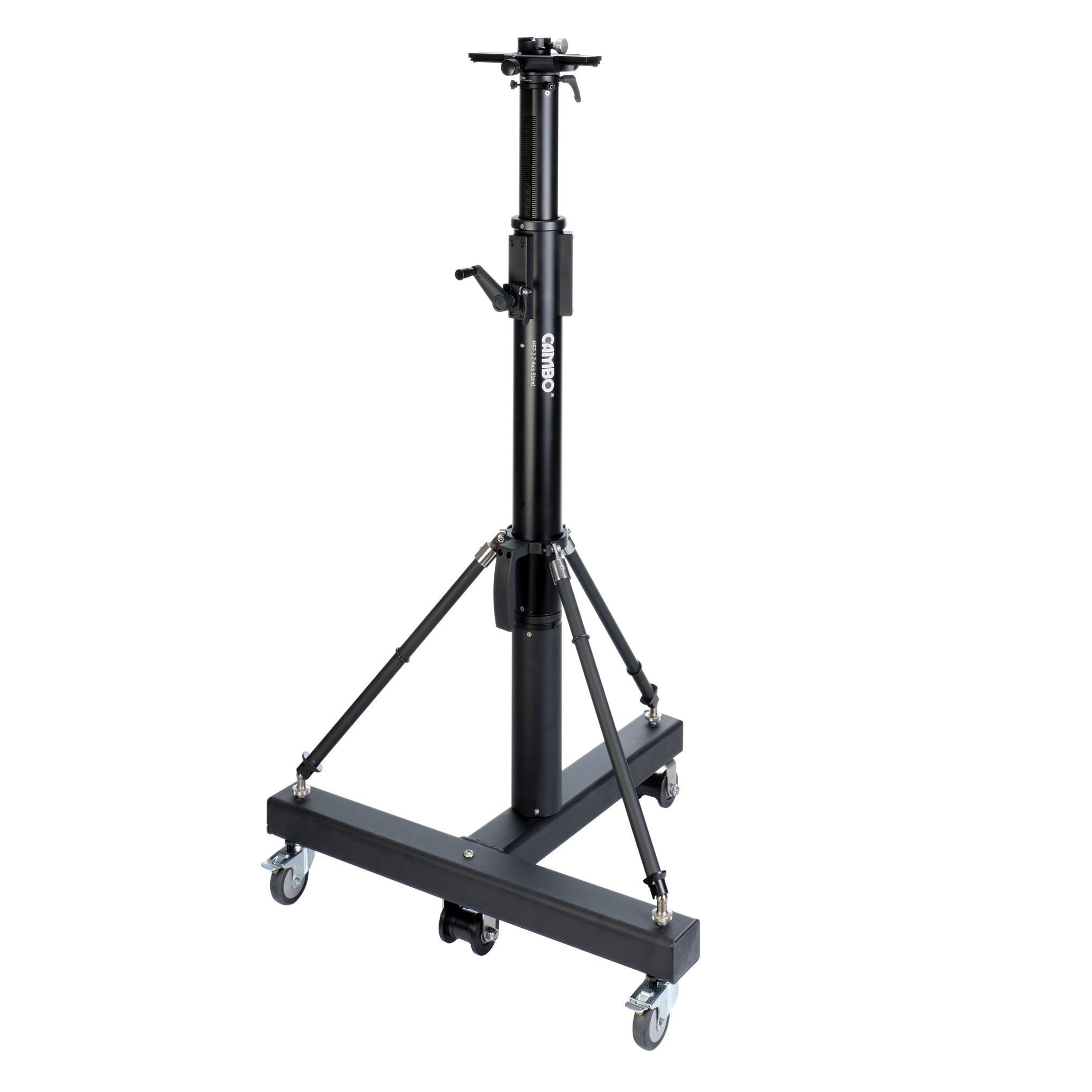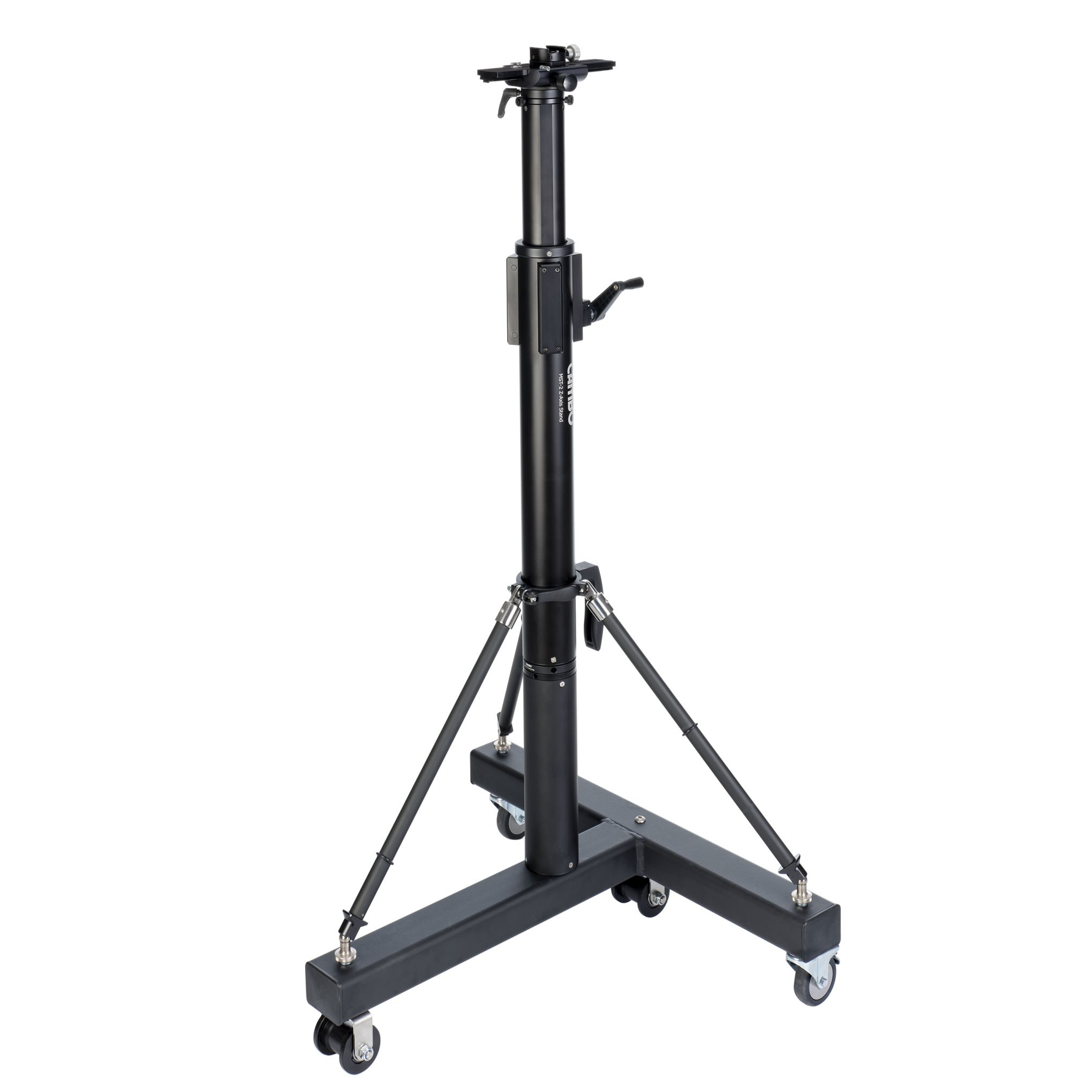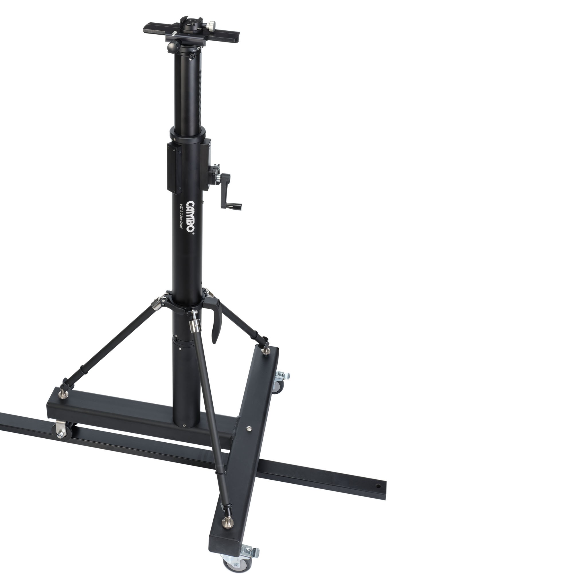 The MST column combined with the larger base with added track wheels. This is for use on a mono track, like used in art reproduction studios. The top of the colomn has a V-Groove which accepts various adapters. Height adjustment is by crank and can be locked, although the mechanism is self-locking. If needed the column can be extended in 30cm segments.