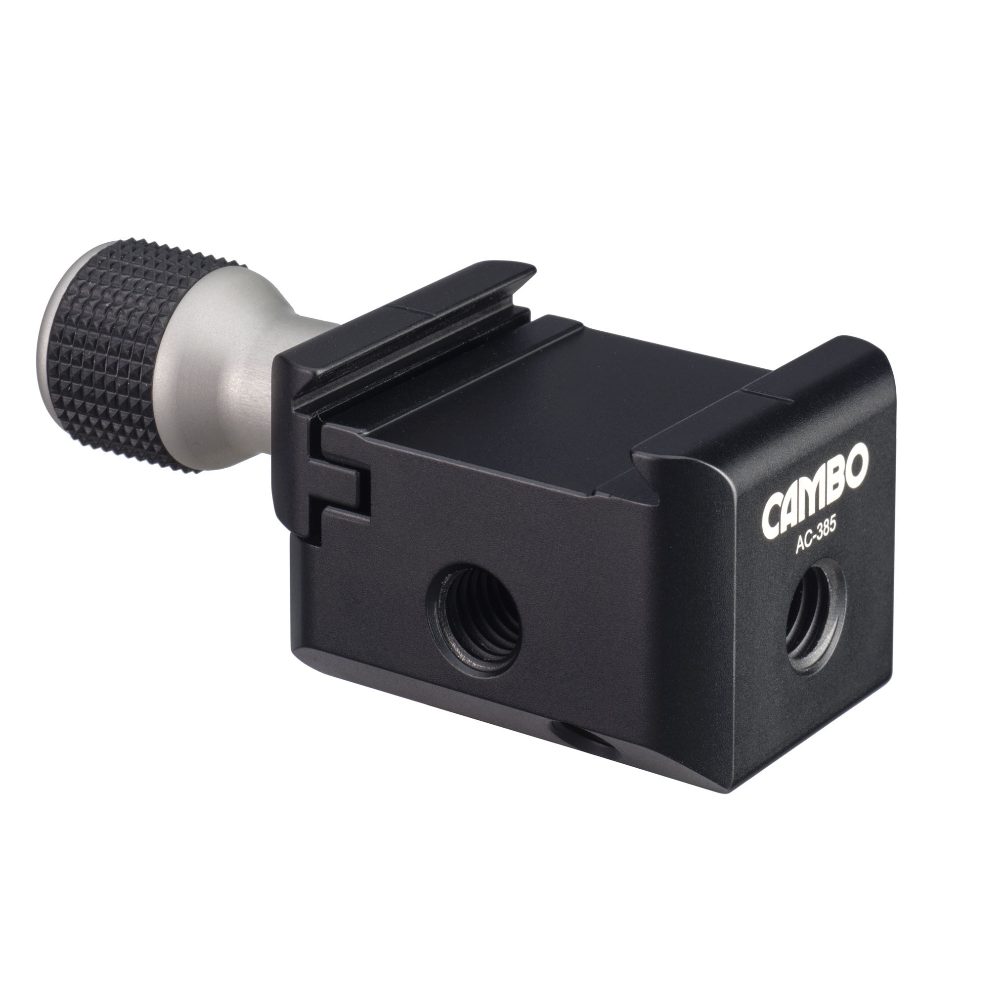 The AC-385 accessory holder attaches directly to the Arca style monorail of the Actus view cameras. It offers three 3/8" and two 1/4" attachments and a cold shoe. The latter comes in handy to attach a flash trigger.