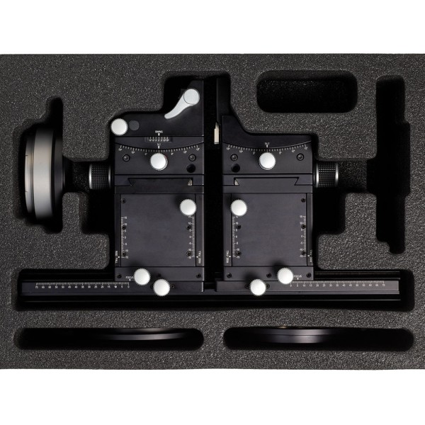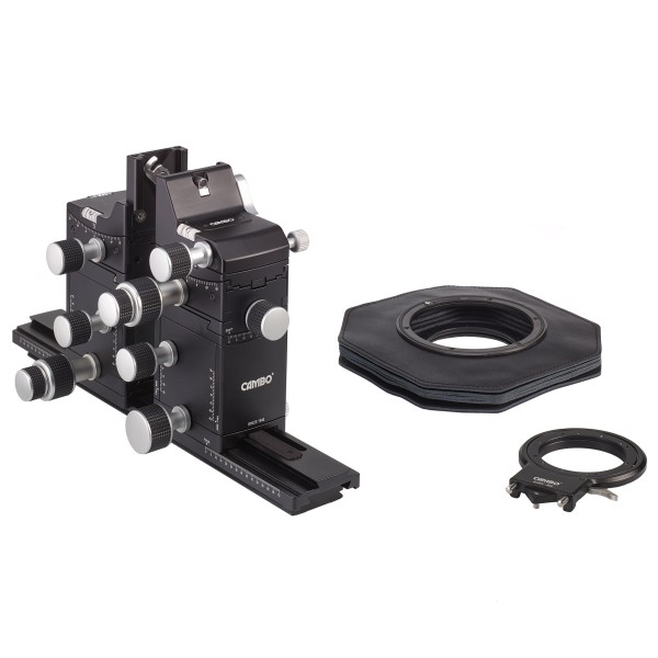 The Actus-MV base completed with the universal bayonet adapter ACMV-86E and bellows AC-214. ACMV-86E accepts a vast range of bayonets for mirrorless and DSLR cameras and features integrated rotation from landscape to portrait.