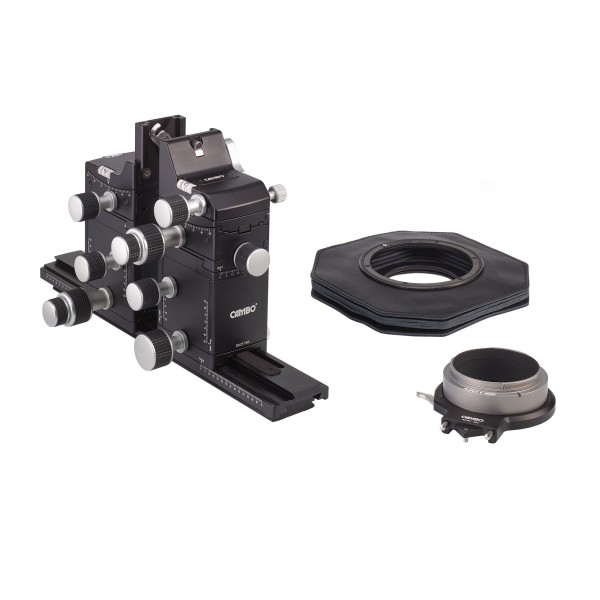 The Actus-MV base completed with adapter ACMV-863 and bellows AC-214. ACMV-863 enables the use of the Fujifilm GFX-100 body and features integrated rotation from landscape to portrait.