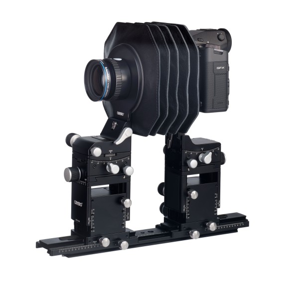 The Actus-MV base completed with adapter ACMV-862 and bellows AC-214. ACMV-862 enables the use of Fujifilm GFX-50 and GFX-100s camera bodies and features integrated rotation from landscape to portrait.