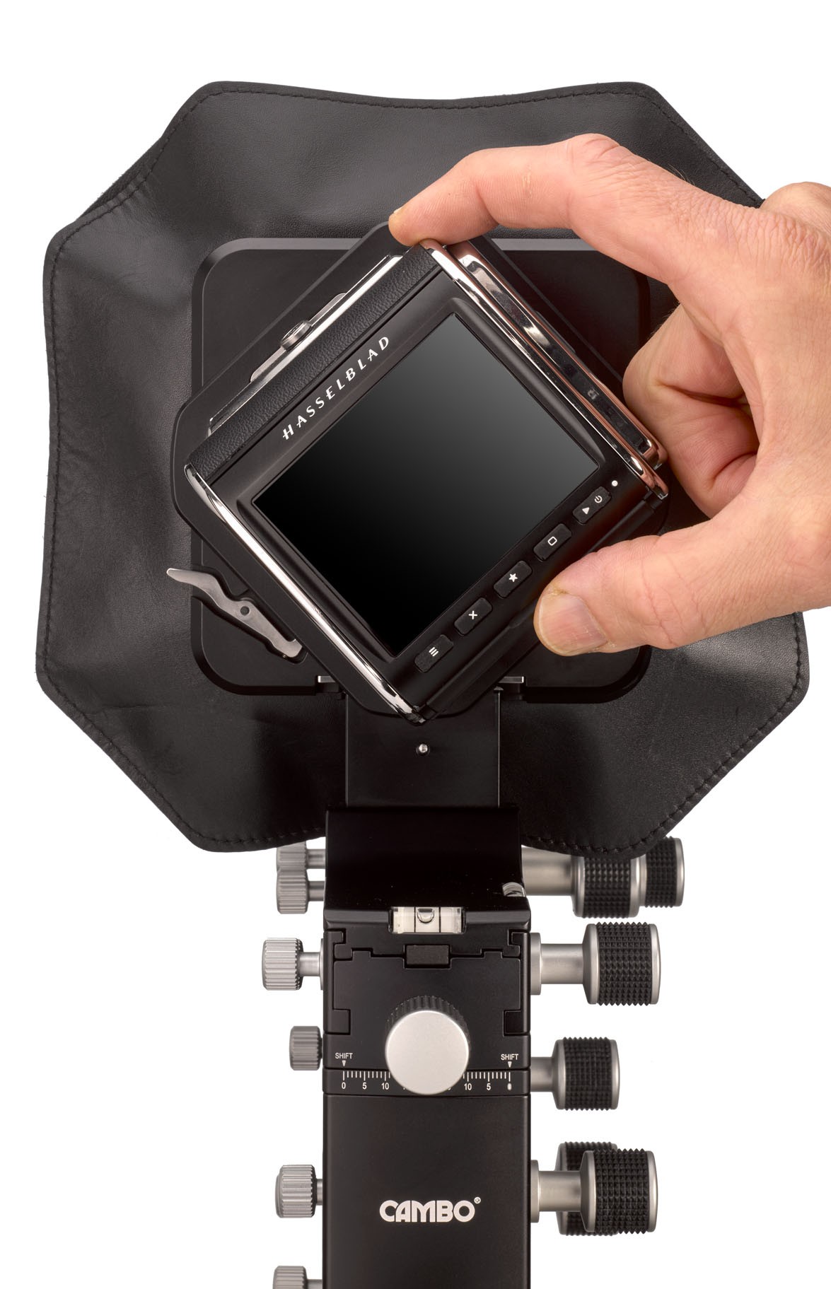 The Actus-MV base completed with ACDB-991 digital back adapter and ACDB-254 bellows. The set-up for use with digital backs featuring the Hasselblad-V interface. Adapter ACDB-991 has an integrated rotation from landscape to portrait orientation.